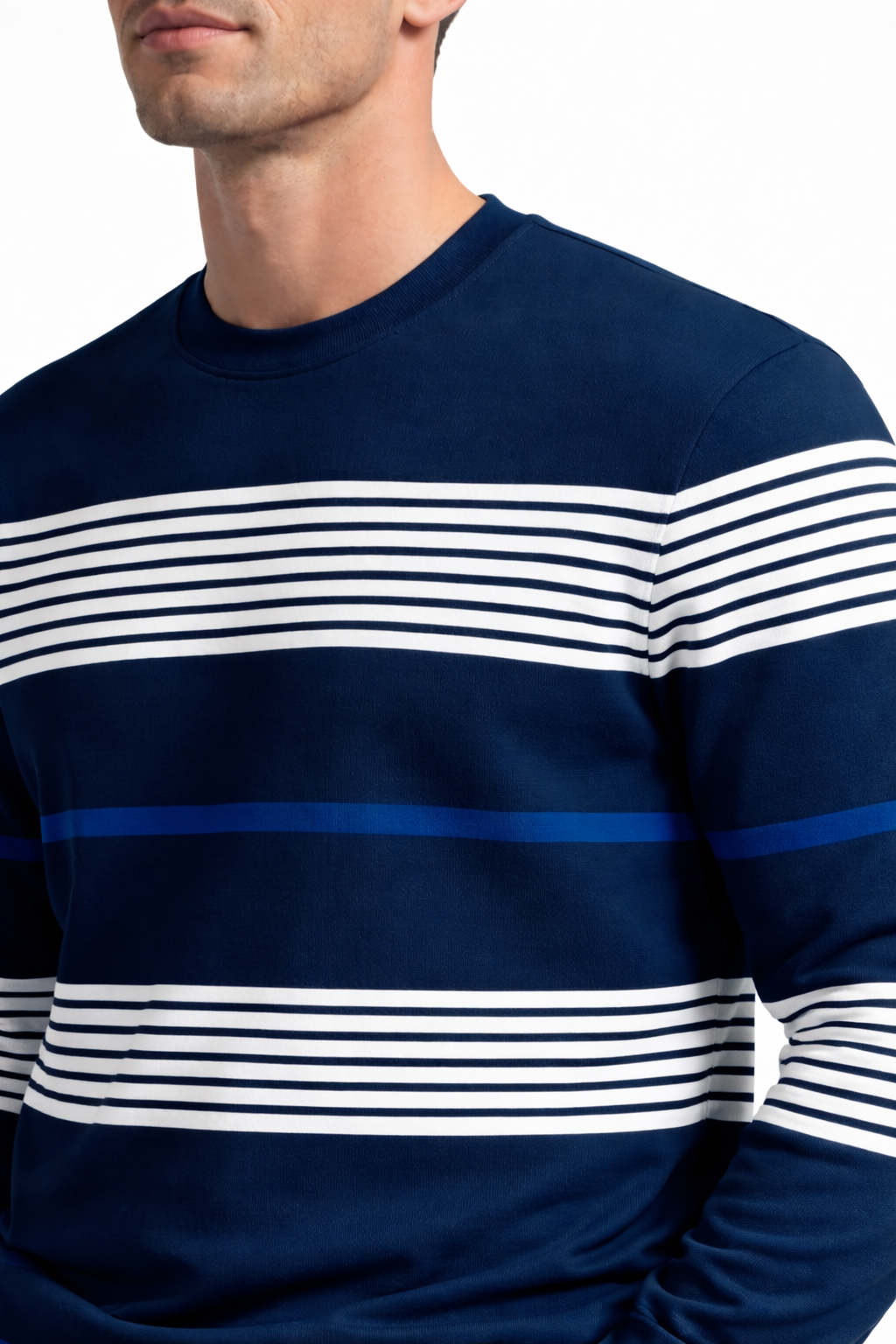 Les bandes horizontales structurent la silhouette et insufflent un dynamisme raffiné, tout en conservant une élégance naturelle.